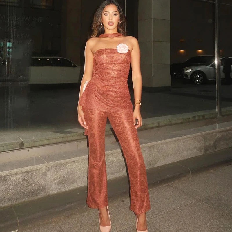 This lace corset and pants set brings elegance with a bold twist. The backless corset features romantic lace details and a lace-up closure that flatters your shape, while the sleek pants create a long, streamlined look. Perfect for rooftop parties or formal nights out this set guarantees all eyes on you.